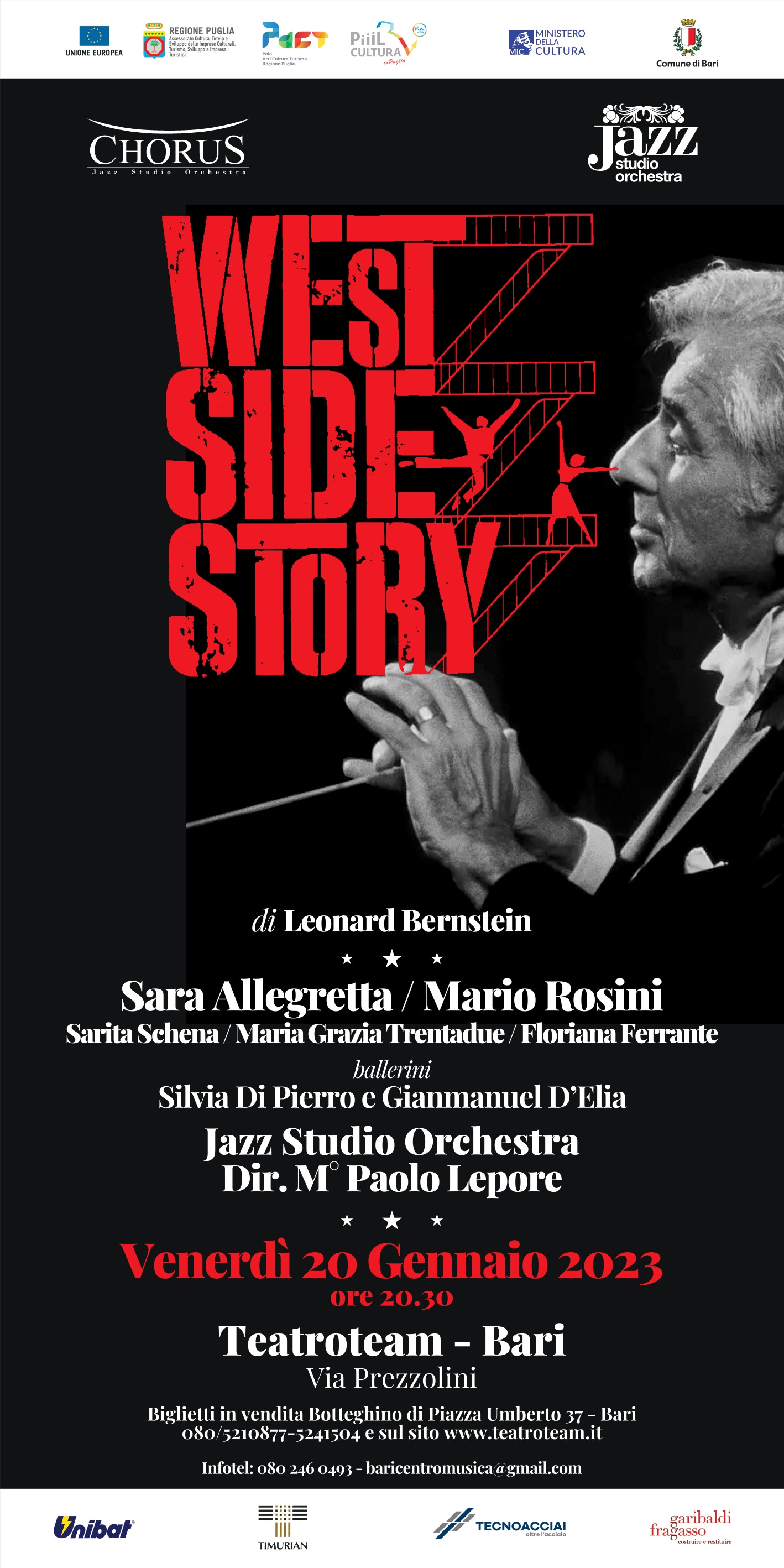 Sul palco la Jazz Studio Orchestra diretta dal Mยฐ Paolo Lepore che omaggerร uno dei piรน famosi musical scritti da Bernstein grazie anche agli arrangiamenti originali di Dave Grusin.